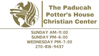 We would like to welcome you to The Potter's House Christian Center in Paducah, Kentucky. We welcome the opportunity to minister to your spiritual needs. At the Potter's House, we are dedicated to encouraging individuals to have a relationship with Jesus Christ with the community of a church congregation.